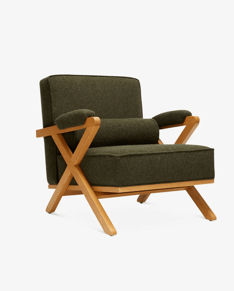A modern accent lounge chair with textured fabric upholstery and a solid wooden X-frame, blending clean lines with warm, handcrafted elegance.