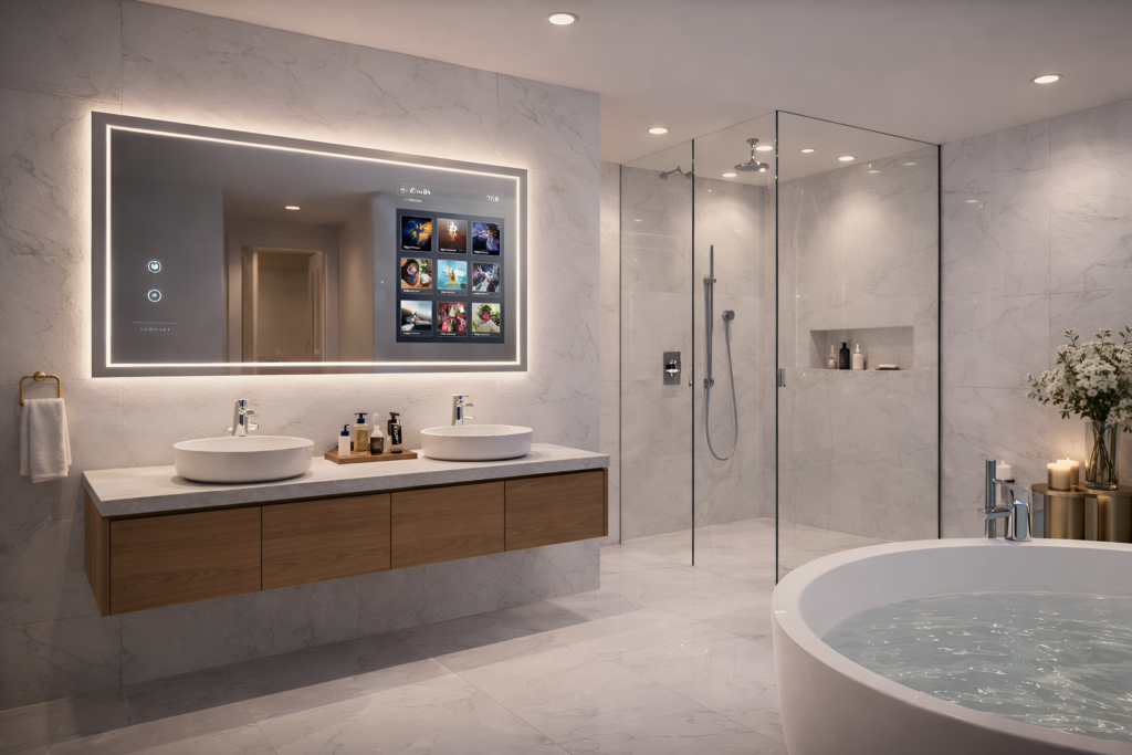Smart mirrors combine technology with elegant design. These mirrors can display information like: